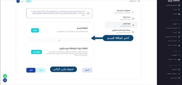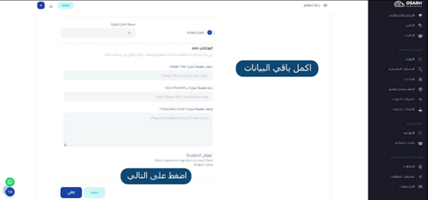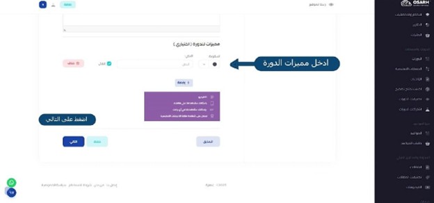 إدخال مميزات الدورة (إختياري) – الضغط على أيقونة التالي للإكمال