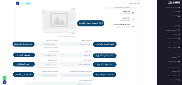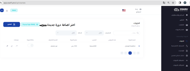 اضغط على أيقونة "إضافة دورة جديدة" للبدء في إضافة الدورات والمحتوى الخاص بها